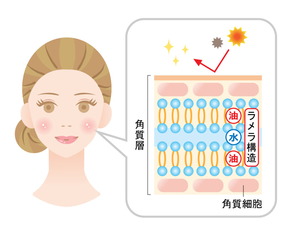 私たちの肌の角層には、水分と油分がミルフィーユのような層状に重なった「ラメラ構造」と呼ばれる仕組みがあります。